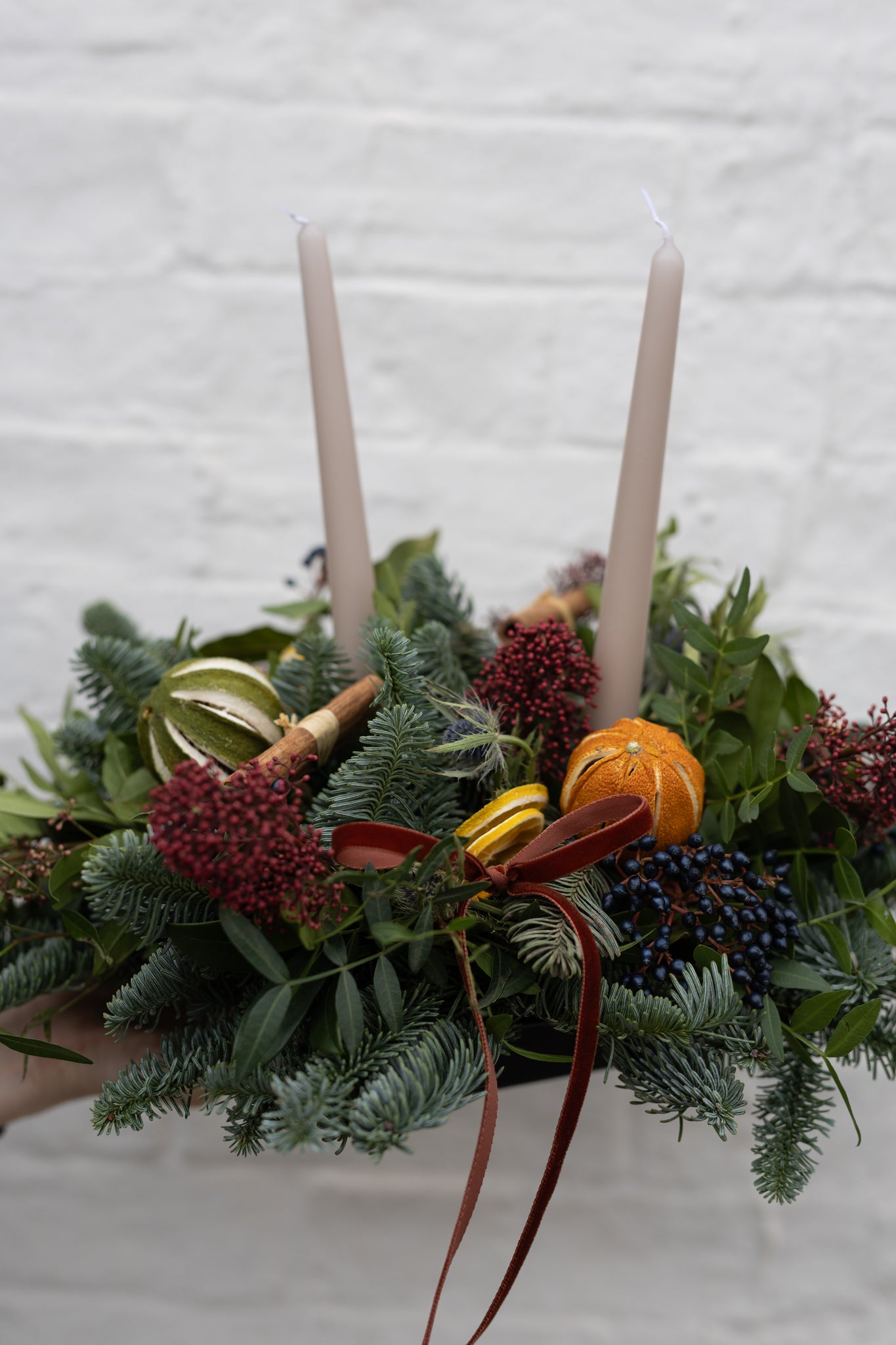 Our a traditional Christmas centrepiece does exactly what it says on the tin! Best seasonal foliage, a mixture of dried fruits, viburnum berries & thistles.